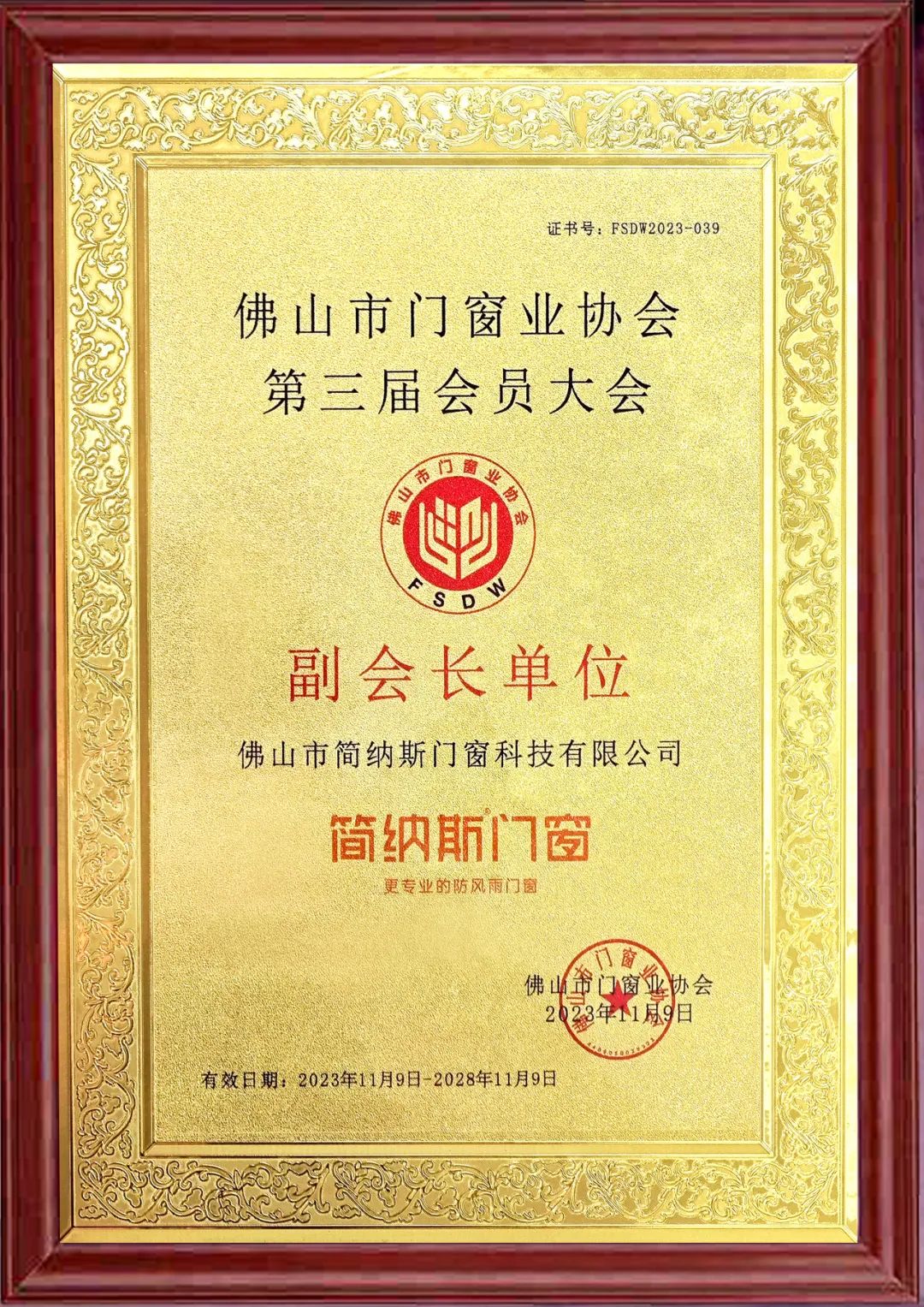 会上,简纳斯门窗凭借强大的研发能力、卓越的产品质量、雄厚的品牌实力及对行业的贡献力,荣获本次佛山市门窗业协会【副会长单位】的授牌。本次荣膺,是行业对简纳斯门窗追求高质量发展和贡献的肯定与认可,未来,简纳斯门窗将不忘初心、砥砺前行,继续携手佛山市门窗业协会、各门窗企业共同推动门窗行业高质量发展,致力推进产业发展创新、持续发展,为打造“有家就有佛山造,有家就有佛山门窗”的美好愿景持续在努力。