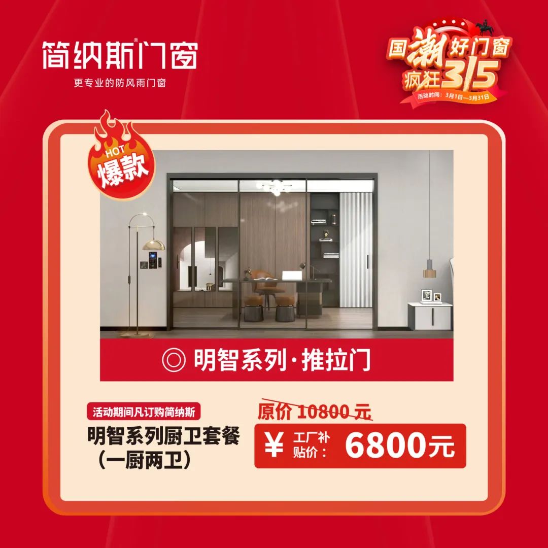 为了让春季装修的业主们省薪省时装新家,简纳斯门窗此次315活动推出了卫士系列平开窗、雅典卫城系列推拉窗、明智系列推拉门等多款极具性价比的爆品,可满足阳台、卧室、厨房等不同空间的一站式定制需求。
