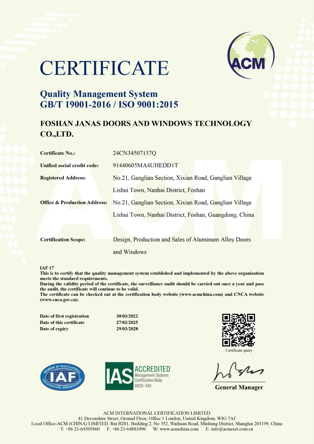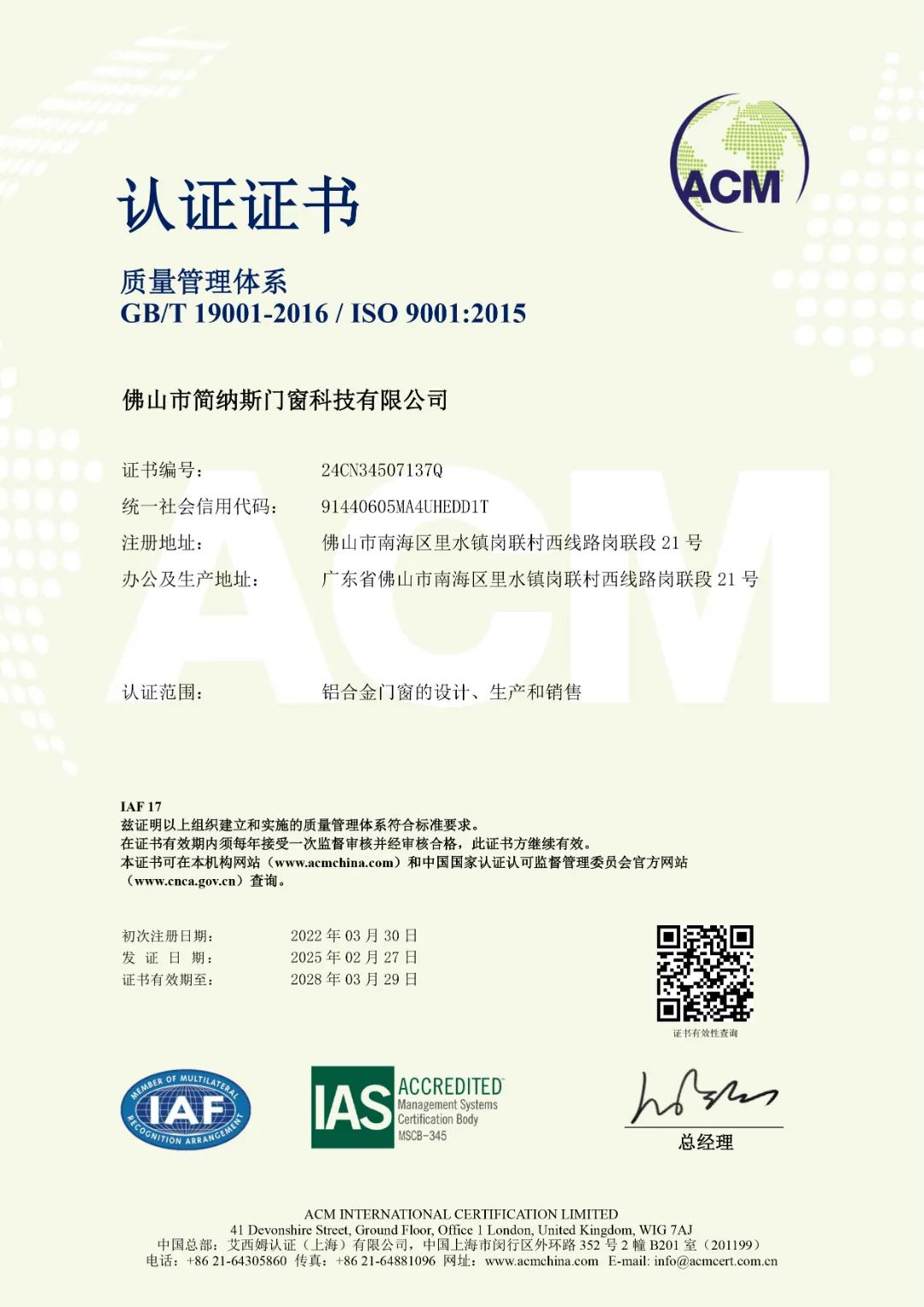 ISO9001认证的背后,是简纳斯门窗以品质铸口碑的坚守,更是市场与客户的深度信赖。这份荣誉不仅是品牌实力的见证,更是前行的动力。未来,简纳斯门窗将持续深耕质量管理,以创新为笔,书写品质与实力的新篇章,为消费者带来更优质的门窗体验。